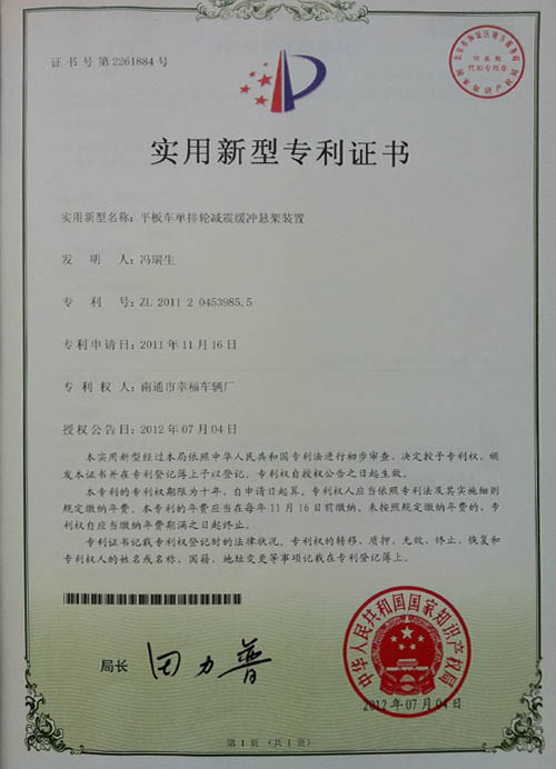 平板車單排輪減震緩沖懸架裝置專利證書(shū)